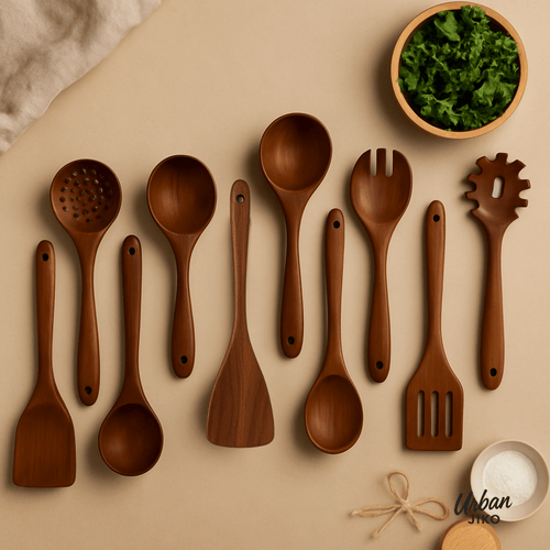 High-Quality Teak Wood: Renowned for its exceptional strength and stunning golden-brown hue, teak wood is naturally resistant to moisture and wear, ensuring these utensils stand up to daily use while maintaining their beauty.